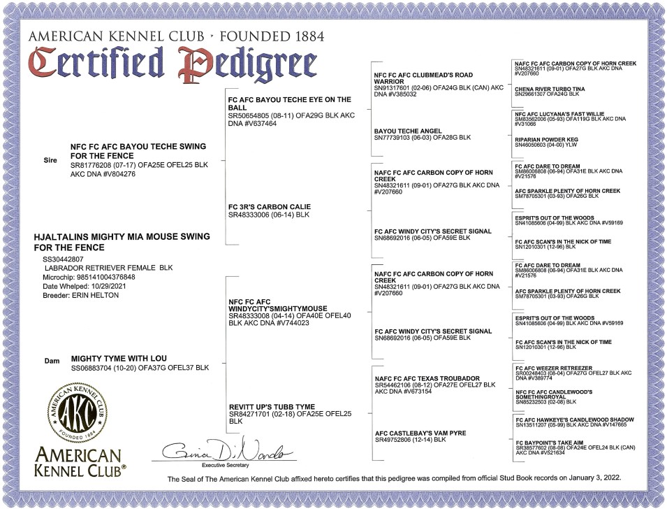Mia er field trial labrador, ræktuð af Erin Helton, og er úr 8 hvolpa goti. Hún fæddist í Gadsden, Alabama í Bandaríkjunum 29.10.2021.